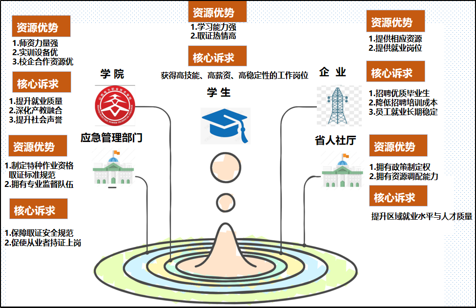 針對上述問題,學(xué)院精準(zhǔn)識別利益相關(guān)方,通過“校政合作取證、校企合作育才、雙線協(xié)同育人”,開辟高技能、高薪資、高穩(wěn)定性的高質(zhì)量就業(yè)新賽道,為電力行業(yè)輸送優(yōu)質(zhì)高技能人才,回應(yīng)“實現(xiàn)高質(zhì)量就業(yè)”的時代命題。