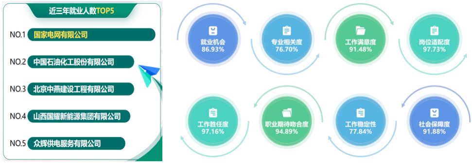 項目實施以來,學(xué)院工作質(zhì)效和學(xué)生職業(yè)技能顯著提升,高質(zhì)量就業(yè)問題得到解決。2022級學(xué)生持證率達92.18%,2024年在各類技能競賽中獲得國家級獎項10項、省級52項,持證學(xué)生成為人才市場的“香餑餑”。畢業(yè)生中,24.48%入職國企,其中累計考入國網(wǎng)公司系統(tǒng)215人(含主業(yè)109人、供服96人);75.52%入職其他企業(yè),學(xué)生工作滿意度達91.48%,高質(zhì)量就業(yè)成效凸顯。