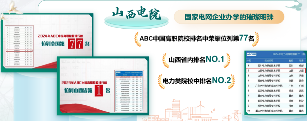 2024年ABC中國高職院校排名中,學(xué)院位列全國第77名、省內(nèi)第1名、電力類院校第2名。率先開展的“1+4”取證工作在全省51所職業(yè)院校及國網(wǎng)系統(tǒng)內(nèi)12所電力高職院校中獨樹一幟,形成可復(fù)制的高職高質(zhì)量就業(yè)“電院方案”,彰顯國網(wǎng)公司在教育領(lǐng)域積極履行社會責(zé)任、推動行業(yè)發(fā)展的擔(dān)當(dāng)與作為。